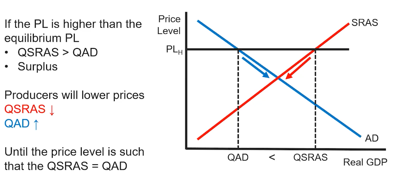 In an instance where the price level is higher than the equilibrium price level, we will essentially have something similar to AP Microeconomics Unit 2.7 Market Disequilibrium. In this case, since the is greater than the , we will have a surplus. As a result, producers will lower their price which will reduce the quantity and correspondingly increase until the price level is such that . The reverse will happen if the price level is lower than the equilibrium price level.