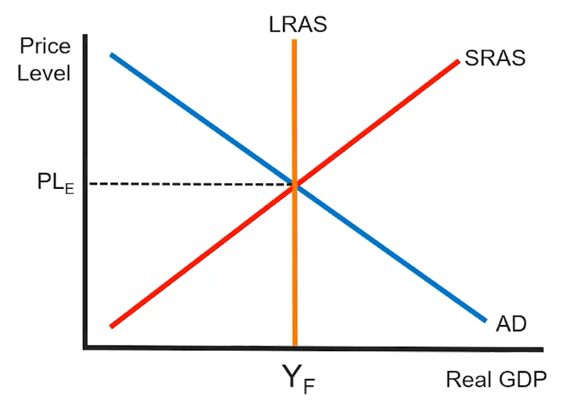 When the economy is in long-run equilibrium, the current output will equal the potential output, where the potential output is represented by a vertical curve at . This is represented through the Long-Run Aggregate Supply Curve.