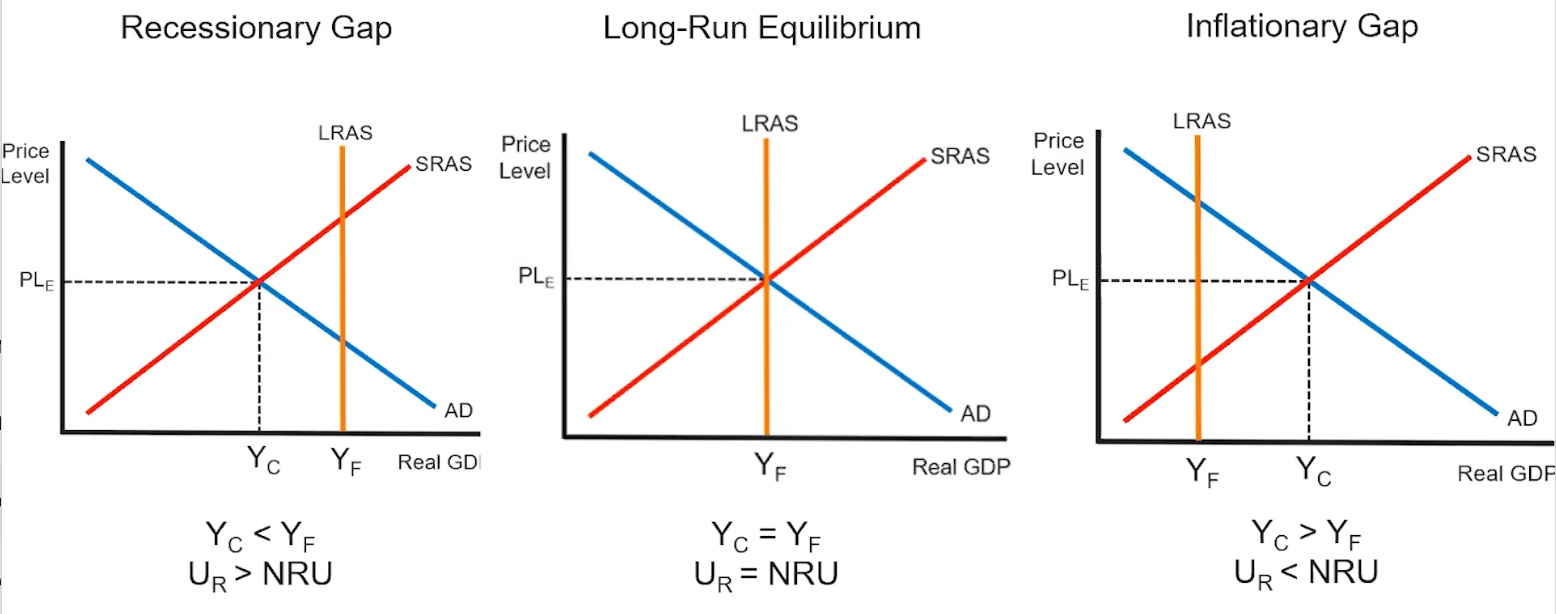There can also be disequilibrium in the format of recessionary and inflationary gaps. In an instance where the long-run equilibrium quantity is greater than the short-run equilibrium quantity, we have a recessionary gap. Similarly, in an instance where the long-run equilibrium quantity is less than the short-run equilibrium quantity, we have an inflationary gap. This is represented in the following graphs: