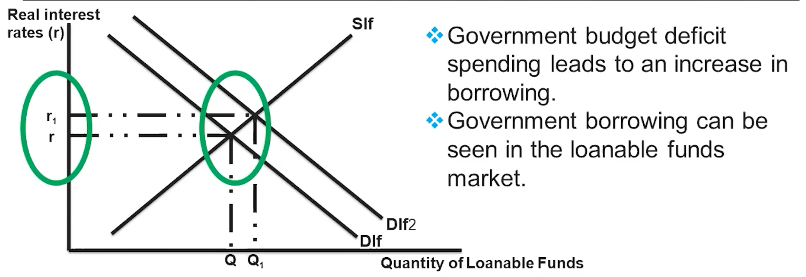 However, this leads to an increase in the government budget deficit, which also leads to an increase in borrowing. This can be seen through a rightward demand shift in the loanable funds market. Essentially, we have higher real interest rates.