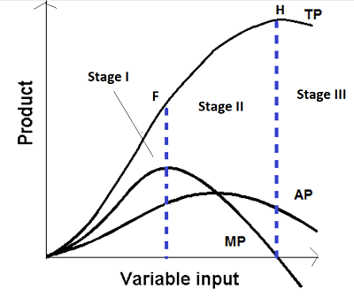 When more units of a variable input (e.g., labor) are added to a fixed input (e.g., land or machinery), the additional output () eventually decreases. This occurs because fixed inputs limit productivity as more variable inputs are added.