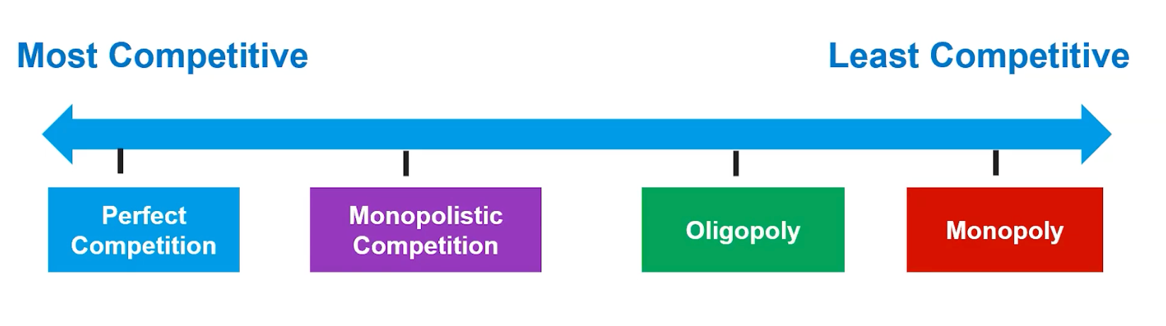 | Number of Competitors | Thousands/Millions | Many (4 largest firsts own <40% of the market share) | Few (4 largest firms own >40% of the market share, giving them pricing power) | 1 |
