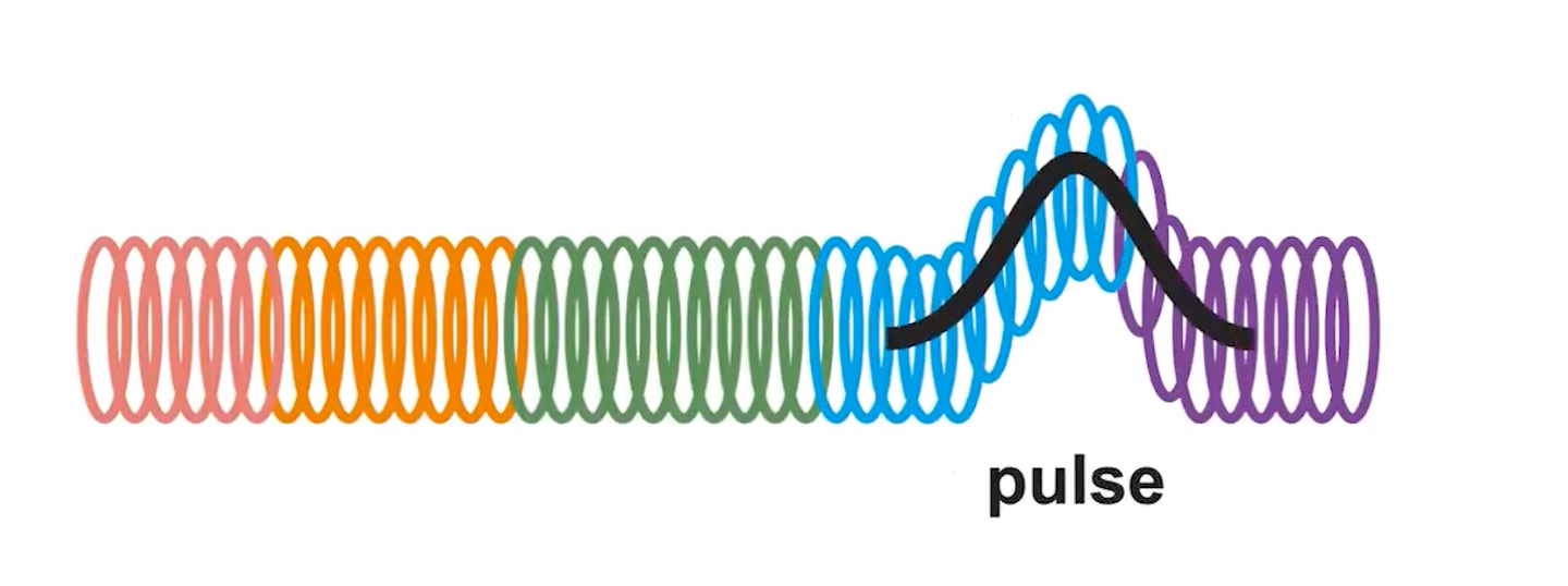 • Transverse Wave: the motion of the medium is perpendicular to the propagation of the wave. For example, the coil moves vertically as the waves move horizontally