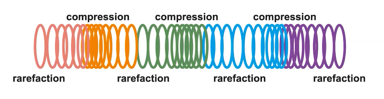 • In drawing a longitudinal wave, the dense parts are called compressions and the spread out parts are called rarefactions