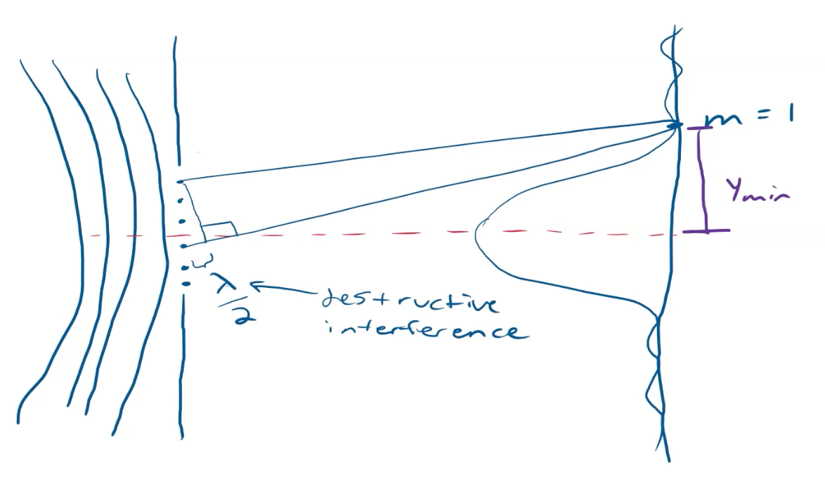 Destructive interference is what leads to the dark spots in diffraction. Essentially, two waves will match nodes with antinodes, resulting in dark spots on the surface. Each two pair where the distance is will form a dark spot. This derives the formula: where: