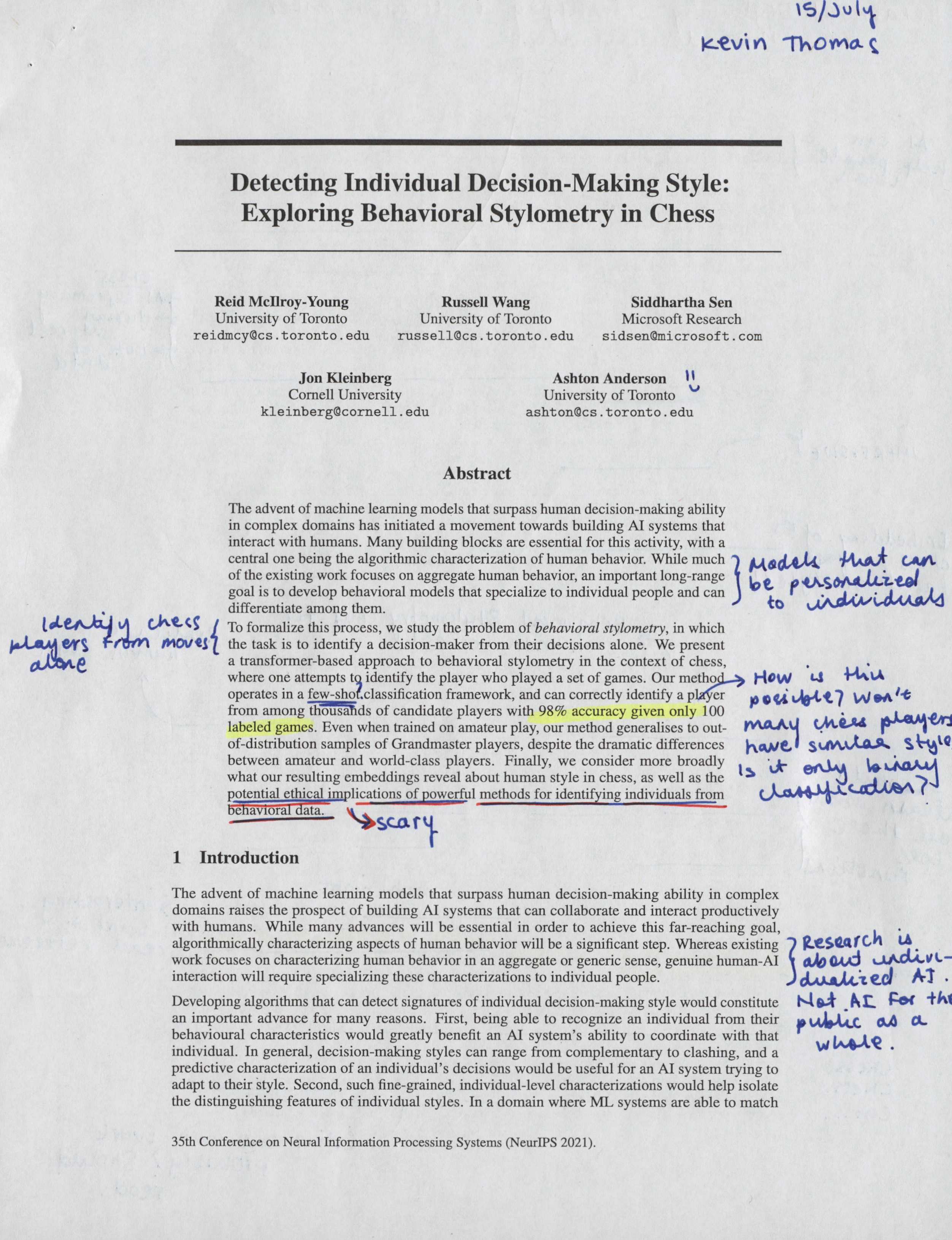 What if you could identify a chess player just by looking at the moves they make? This paper by researchers from the University of Toronto, Microsoft Research, and Cornell University explore the concept of behavioural stylometry β essentially, recognizing a person by looking at their actions alone.