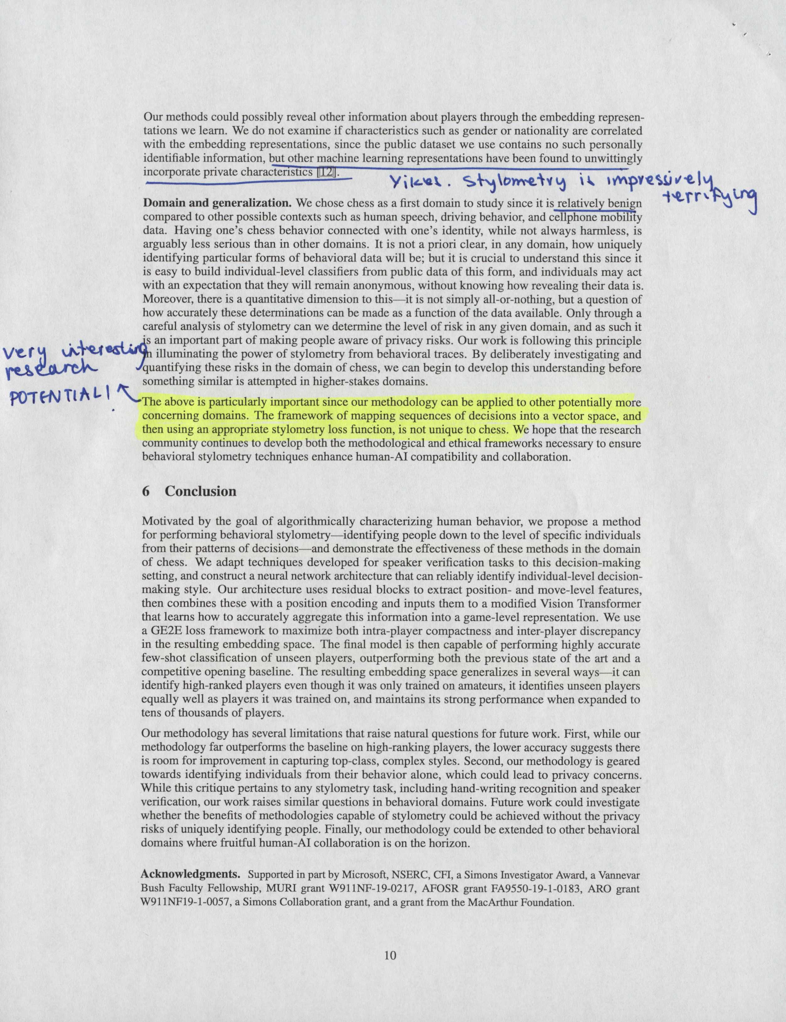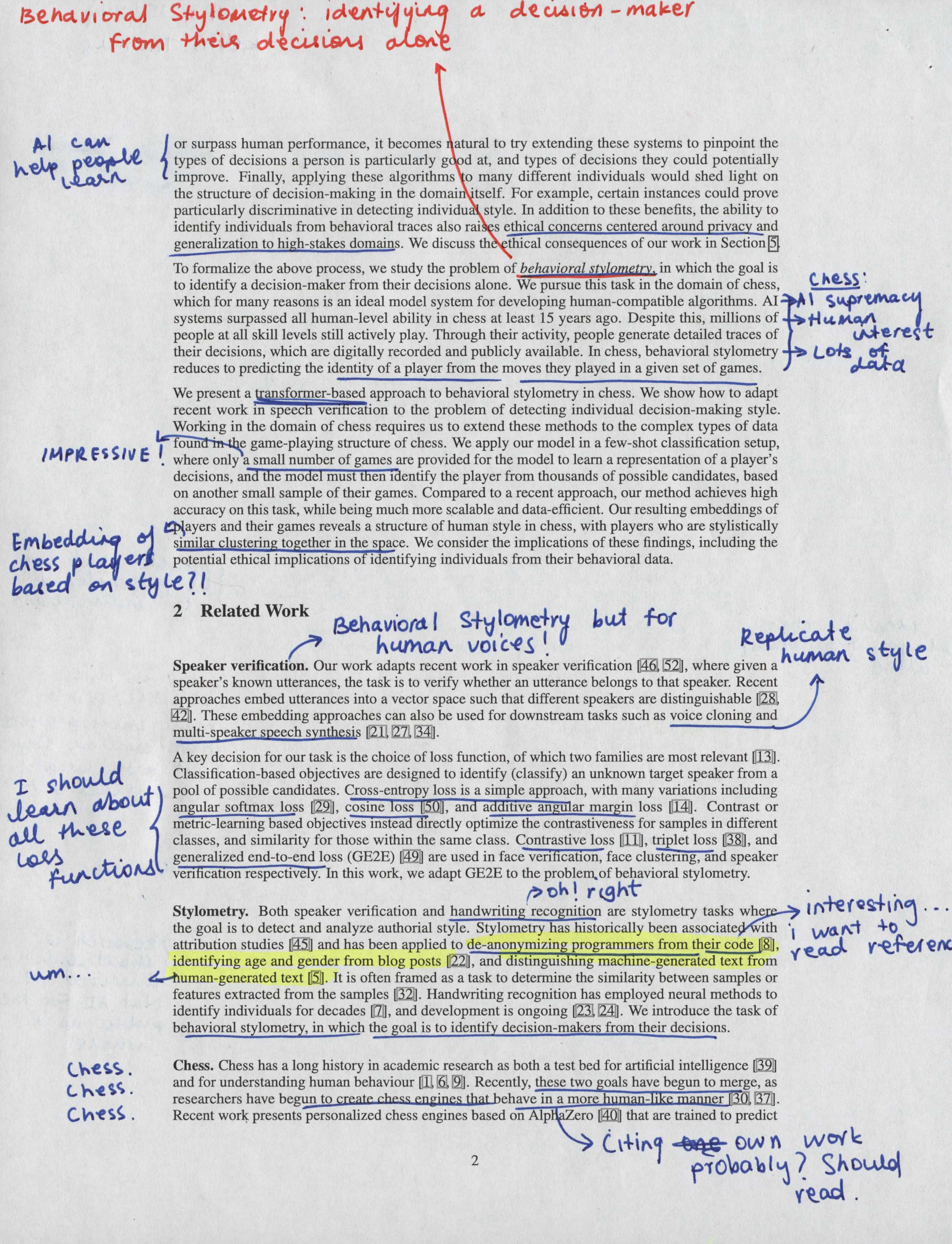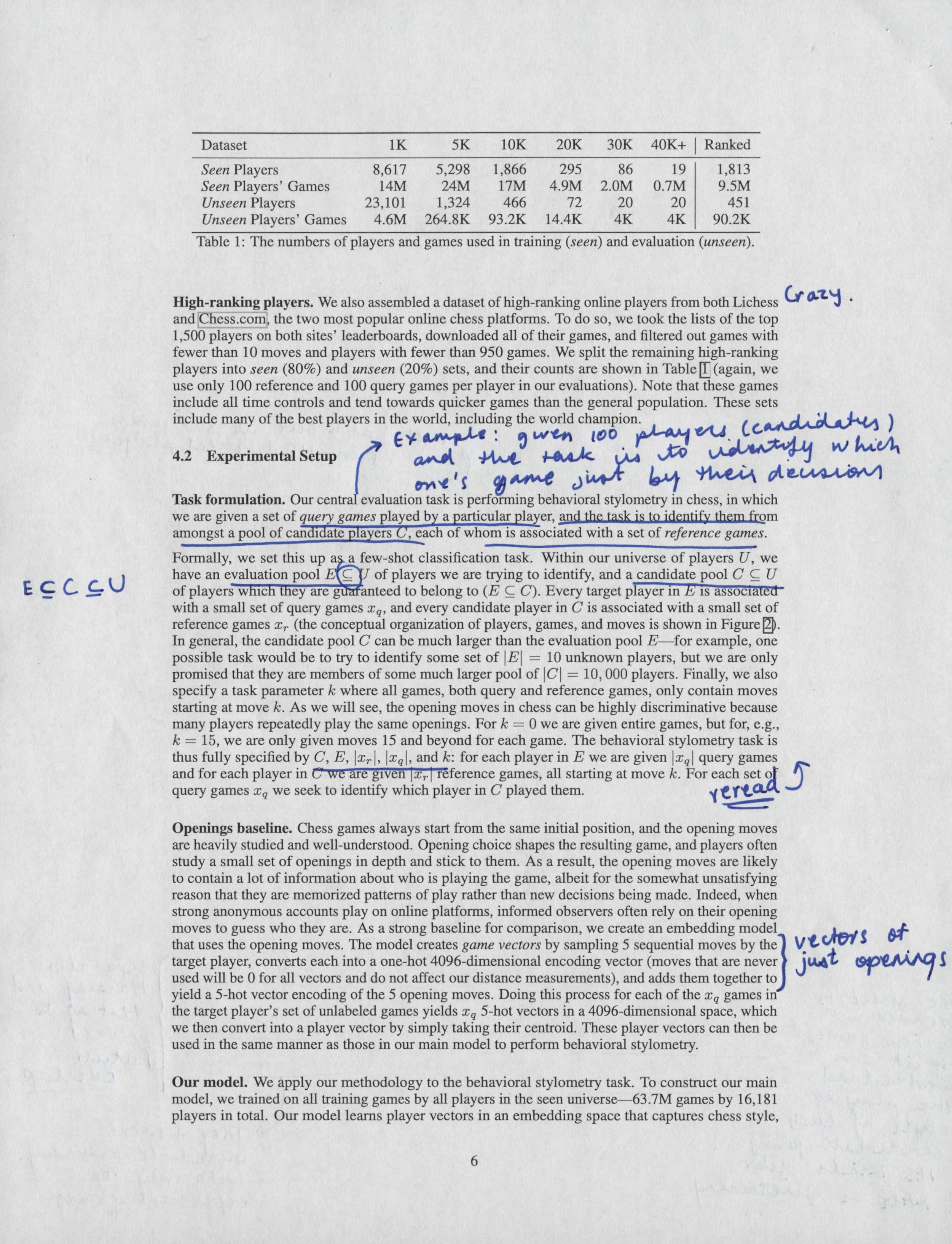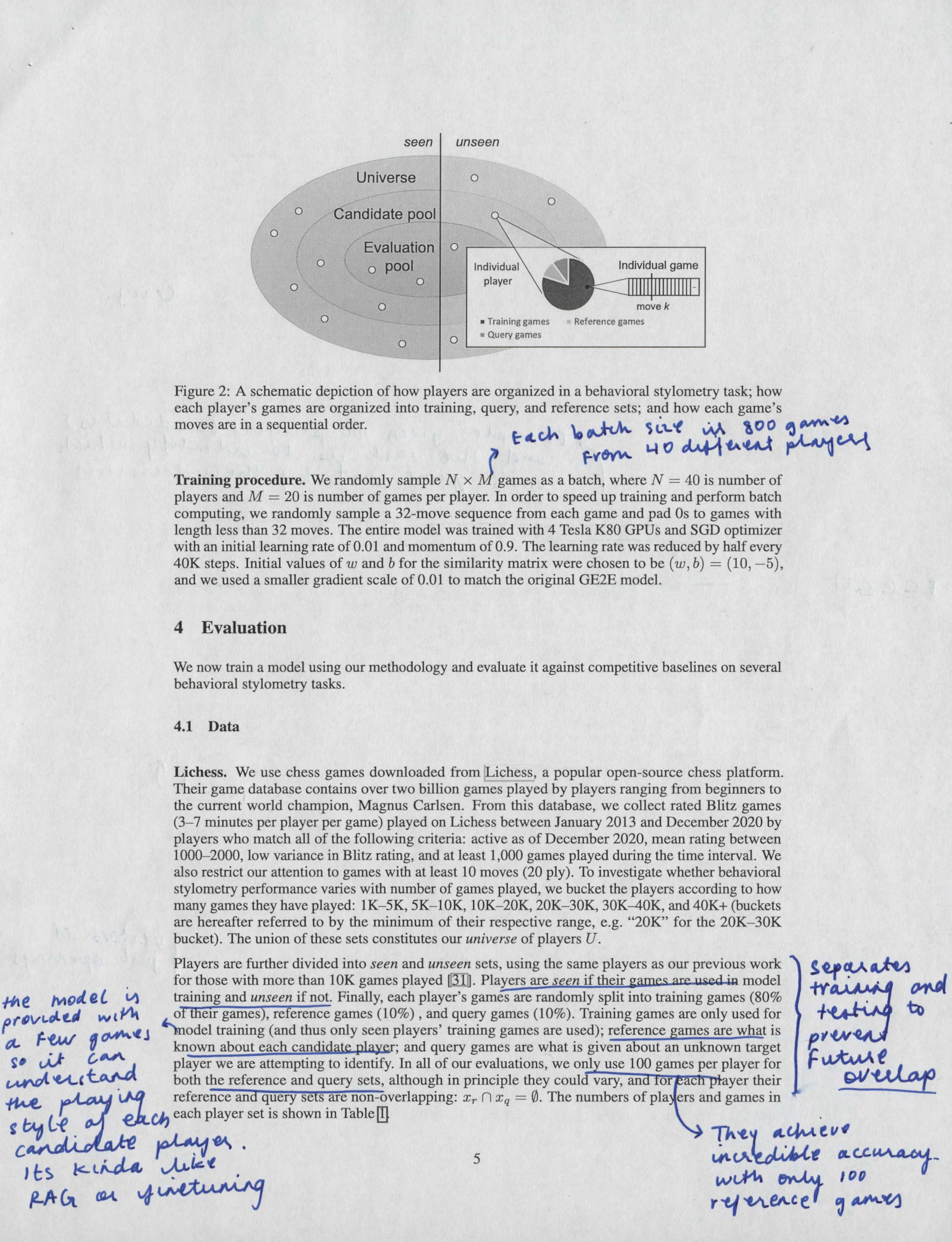 - This entire process is coined as behavioural stylometry*, where the goal is to identify a decision-maker just from their decisions. In the paper, they pursue this through chess (identifying players from their moves alone)