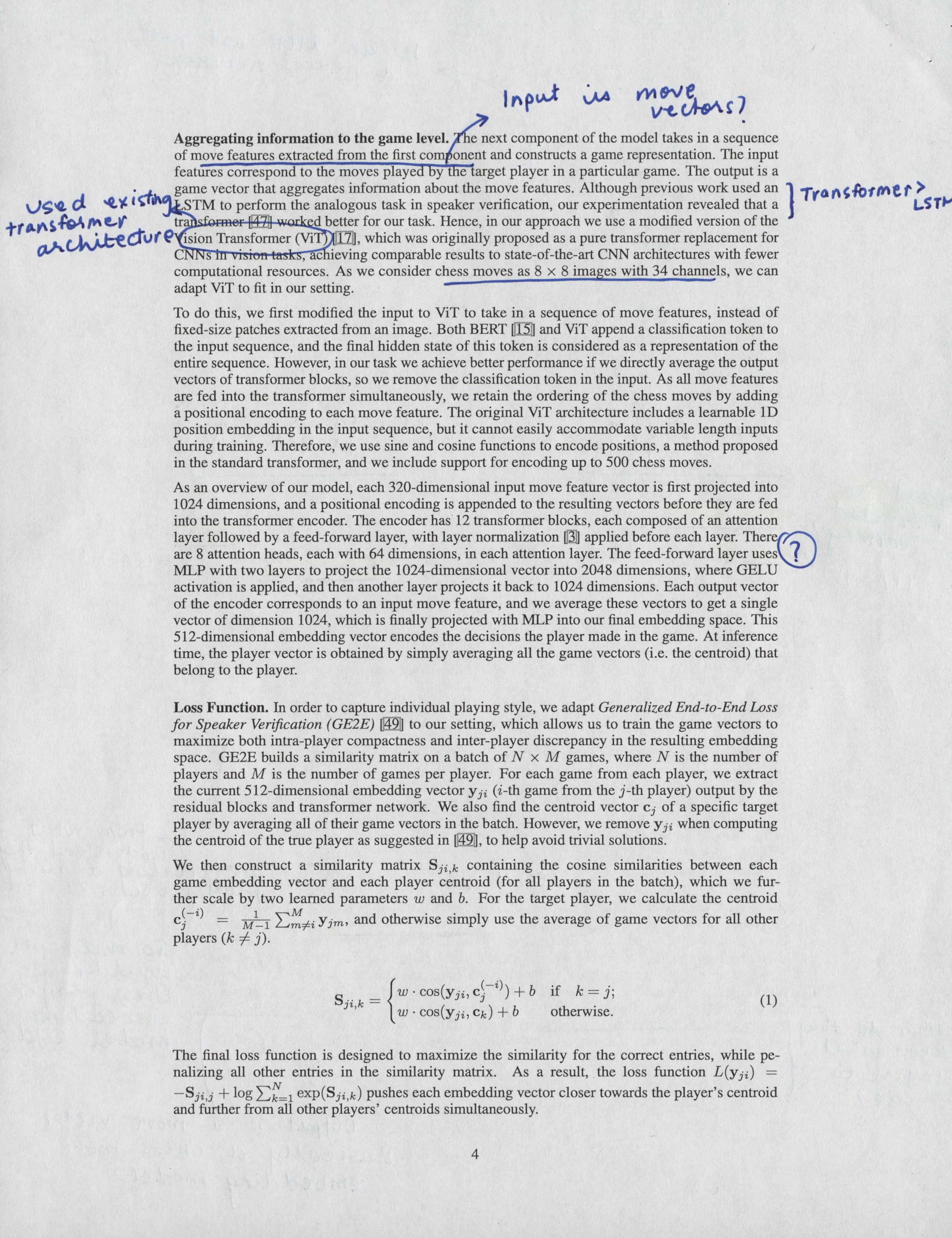- Each output vector corresponds to an input move feature, and these vectors are averaged to get a single vector of 1024 dimensions, which is projected with MLP into the final embedding space.